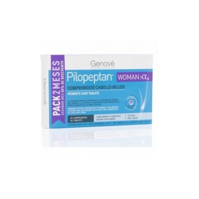 Pilopeptan woman 50r de genové dermatologics está formulado específicamente para cubrir las necesidades nutricionales del cabello femenino. Contiene vitaminas, minerales, aminoácidos y antioxidantes que contribuyen al crecimiento normal del cabello, protegen frente al daño oxidativo y fortalecen la estructura capilar. Este complemento está especialmente indicado en casos de caída, fragilidad, falta de densidad o situaciones en las que el cabello necesita un aporte extra de nutrientes (cambios hormonales, estrés, dietas, postparto…). Su fórmula avanzada ayuda a: favorecer el crecimiento saludable del cabello. Mantener la fortaleza y brillo natural. Proteger frente a radicales libres y envejecimiento capilar. Formato pack 2 meses (60 comprimidos) con descuento en la segunda unidad. Vía oral | complemento alimenticio | uso diario.