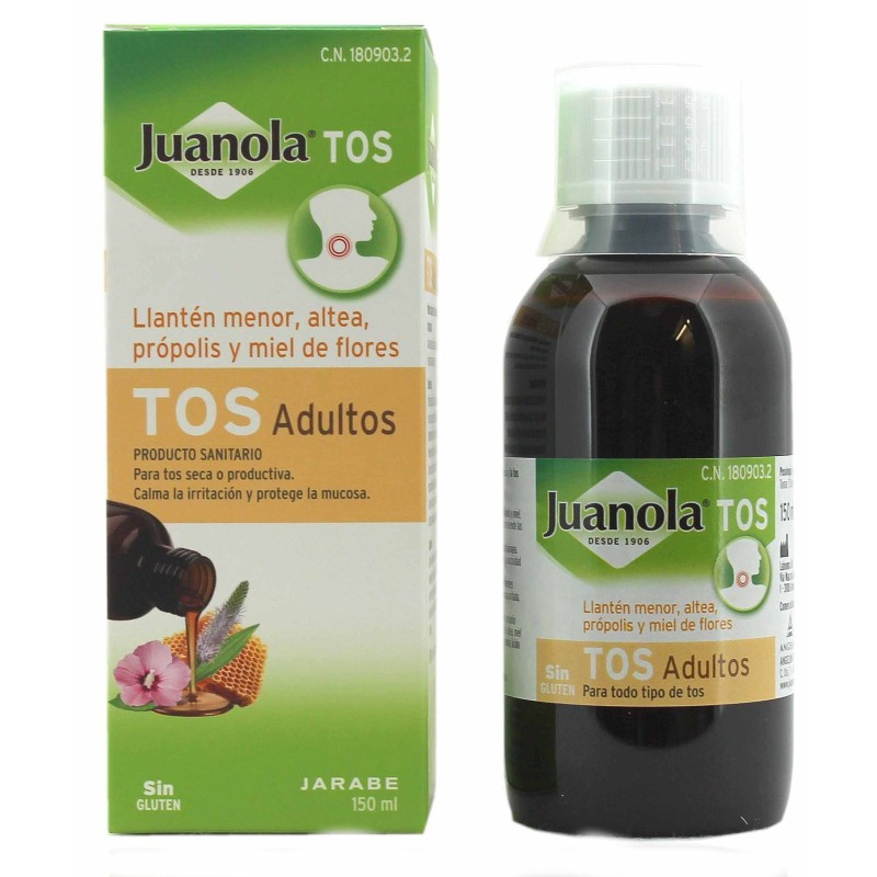 Juanola Tos Adultos es un producto sanitario para el tratamiento de la tos seca y la tos productiva. Crea una película protectora que calma la tos y protege las vías respiratorias superiores. Promueve la protección y la hidratación de la mucosa faríngea. No administrar a menores de 12 años.