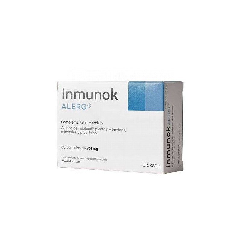 INMUNOK ALERG®, es un complemento alimenticio a base de Tinofend®, plantas, probiótico, vitaminas y minerales que actúa disminuyendo los síntomas de la alergia y la rinitis alérgica, estimulando la actividad de los glóbulos blancos que regulan la respuesta inmunitaria, y reduciendo el número de eosinófilos (células inmunitarias que liberan histamina).
